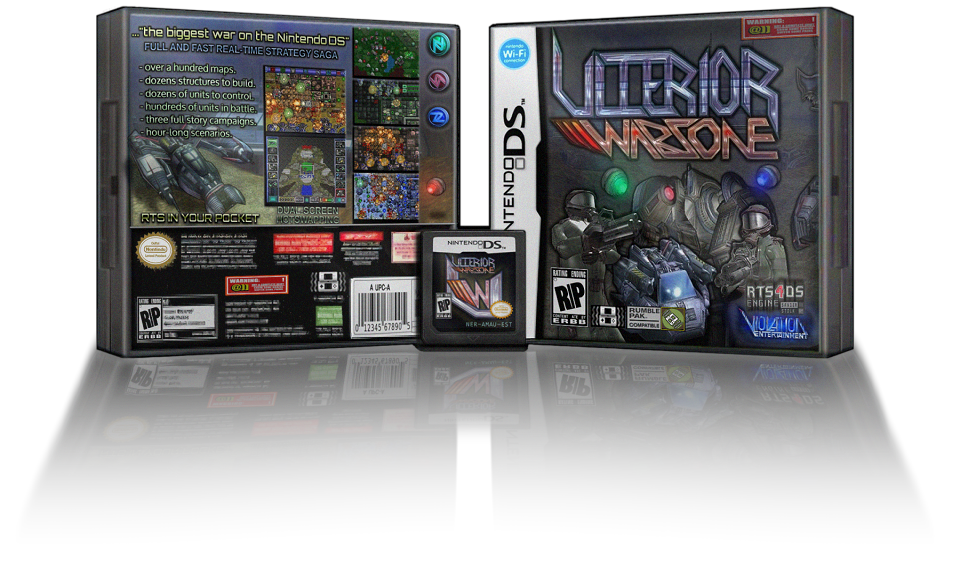 Development began in early 2007 with the aim of being able to run custom real-time strategy games on the Nintendo DS that were not unlike the classic "Dune II - The Battle for Arrakis". This kinship can still be felt in the gameplay of Ulterior Warzone, although many improvements and enhancements were implemented almost immediately in the RTS4DS engine, including notable upgrades to the user interface that take advantage of the Nintendo DS touch screen and more versatile map objectives that are closer to StarCraft in spirit. Lee David Ash at Violation Entertainment had already planned a top-down hovertank shooter for the handheld, and the two developers met and began Ulterior Warzone in late 2007, using prerendered 3D models for most of the graphics.